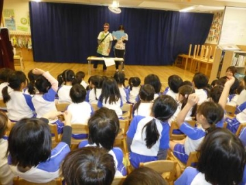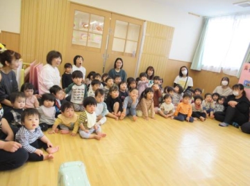 保育士からのお祝いとして、ペープサート「まんまるちゃん!」を見ました。