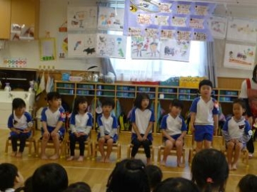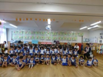 保育士からのお祝いとして、ペープサート「まんまるちゃん!」を見ました。