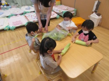 2021年7月12日(月) 食育・さくら組,トウモロコシの皮むき