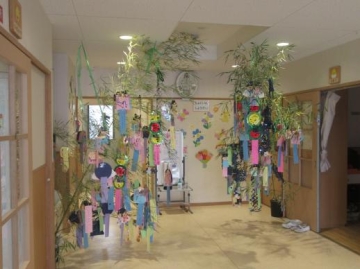 エントランスには各クラスで作った笹飾りを、7月2日のお帰りの時におうちの人と一緒に飾りました。