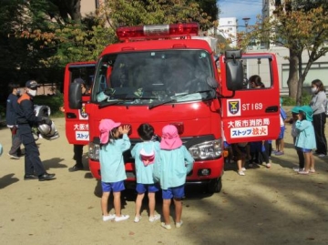 職員による、通報・消火訓練をした後、消防車や消防服・車のしくみを教えてもらい