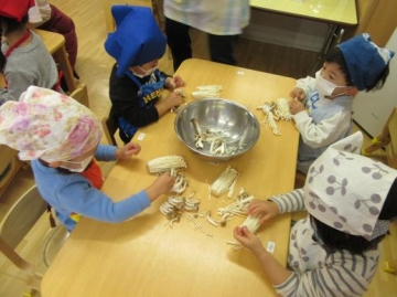 2歳児が給食で使われる食材、しめじとえのきたけをほぐす作業をしました。