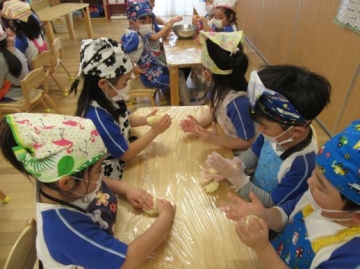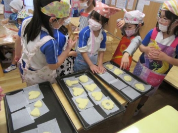 おからと小麦粉を混ぜてバターもいれて混ぜるところが難しい工程だったようだが、グループの友達がボールを支えて協力する姿が見られました。生地が完成すると、次は形作りをしました。みんな自分の好きな形を一生懸命つくっていました。