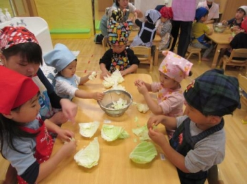 今日は、食育”キャベツをちぎる”作業を一緒にしました。