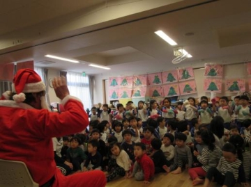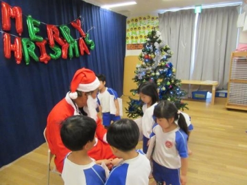 又、お祝いにサンタクロースさんも来てくれ、みんなで♪クリスマスの歌が聞こえてくるよ♪を1~6番までをクラス順に歌い方を変えて 歌ったり、ビックリ箱を見たりして楽しみました。。