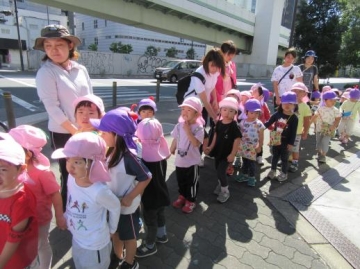 新町保育園2歳児ももぐみさんと一緒に手をつないで島津公園へ行ってきました。