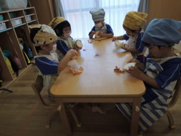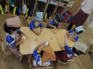 3歳児が、給食のカレーの材料に入っている”たまねぎ”の皮むきをしました。