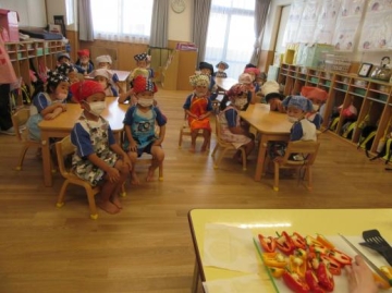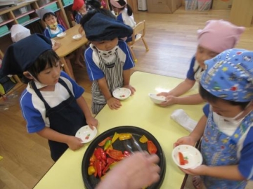 子ども達の前でパプリカを焼いていると「おいしくな~れ!おいしくな~れ!」と大合唱・・・焼きたてのパプリカを頂きました。「おいし~」「ごまのあじする~」・・と喜んで食べていました。パプリカの苦手な子もみんなにつられて食べていました。