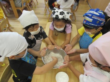 粉がさらさらのときは「わ~ぁきもちいい~」といいながらしていた子ども達。 バターを入れてからは手がべとべと状態でしたが、何とかクッキーの生地を仕上げることが出来ました。
