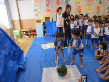 すいかのお姉さんが大きな丸いすいかを3個もってきてくれ、みんなで割って食べました。