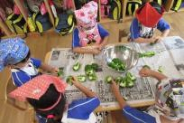 給食の先生に、種の取り方を教わり順次取り掛かりました。「わっ!つぶつぶいっぱい~!」と歓声をあげる子。又家で経験した子もいたり・・・ ピーマンを鼻でかいで「いい匂いする~」などそれぞれの感想が聞かれました。