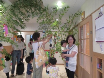 7月のお楽しみ会に第3保育園の子ども達も一緒に参加して、7月生まれの子ども達をお祝いし、七夕の話のぺープサートを見たり手遊びや歌をうたったりして楽しみました。