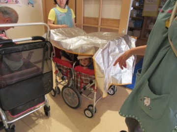 今回は、大雨・風・気温の変化から身を守る緊急用シートを利用して、ポンチョにしたりシートにしたり・・・の見本を見て咄嗟のときの対応をみんなで確認しました。