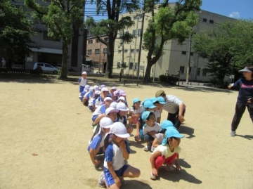新町保育園5歳児ぱんだ組さんとひまわり組さんが島津公園で、リレーやドッジボールをして交流しました。
