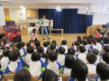 12名の4月生まれの友だちを”はらぺこあおむし”の紙芝居を見たり、うたをうたったりしてみんなでお祝いしました。