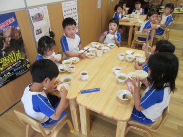 給食時は、「ひまわりぐみが皮をむきました。」とお当番が園内放送をし、みんなで美味しく頂きました。