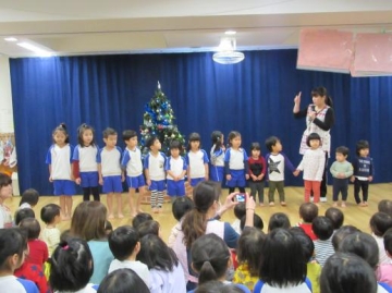 12月生まれの子ども達をみんなでお祝いしました。絵本”てぶくろ”のお話を誕生児も参加してごっこ遊びを楽しみました。落ちていたてぶくろが実は、サンタクロースのてぶくろだったということでサンタさんと一緒に各クラスの出し物をみたり・・・特別にサンタさんがギターを演奏してくれたり・・・サンタさんと♪きらきらほし♪を一緒に歌って楽しみました。