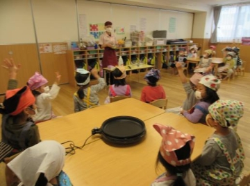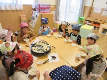 子ども達は、コーンが弾ける音や弾ける様子を興味深く見ていましたが、混ぜるときに種がはじけだしたのにはみんなびっくり~!