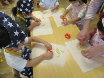 3歳児が3時のおやつ”バタークッキー”の型抜きをしました。エプロンをつけるところから大はりきりの子ども達・・・。