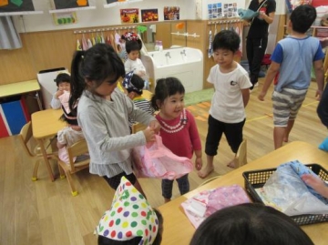 エプロン・三角巾をつけるのはひまわりぐみさんに手伝ってもらいました。