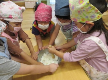 ご飯をつぶすのはグループの友だちがボールを支えて助け合いながら・・・ 形を作るのは手にご飯がくっついてベトベト状態になりながらもハート・星・丸の形に・・中にはいろんな思いがあって細かくなったり・・などもありましたがみんな楽しく作っていました。