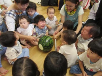 この後みんなで美味しく頂きました!「あま~い!」 「おいし~い!」と無心に食べていた子ども達でした。(中にはスイカが苦手なこも・・・)