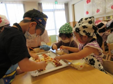 ケチャップソースを塗って、とまと・ソーセージをトッピングする行程をグループで順番にしていき、最後は給食室で焼いて出来上がり!