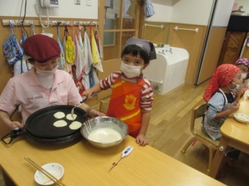 ホットケーキの粉を玉じゃくしですくって鉄板に流す・フライ返しでひっくり返すの行程は、なれた手つきで上手にしていました。
