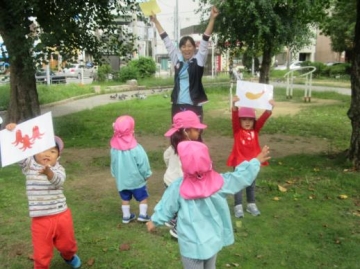 公園では、体操をしたり、異年齢の三つのグループでおべんとうのおかず探しゲームをしたりして楽しみました。