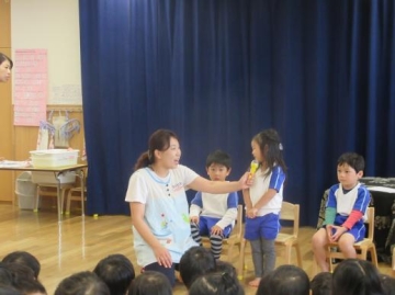 10月生まれの子ども達を紹介し、お祝いに、手品や大型絵本を見てみんなで楽しみました。