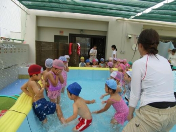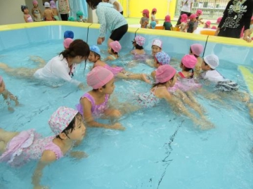 プールではひまわりぐみやすみれぐみさんと一緒に”水け”や