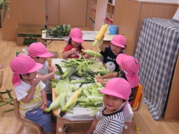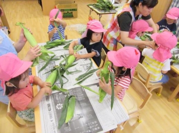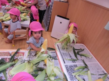3時のおやつで食べる ”とうもろこし” の皮むきを2歳児が始めてチャレンジしました。