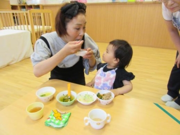 給食では、後期食・完了食の 味付け・固さ・切り方大きさなどを試食も兼ねてみて頂きました。