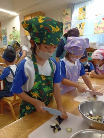 なすびと皮をむいたにんじんを一口大に包丁できりました。なすびは、柔らかかったのかすいすいと切っていました・・が
