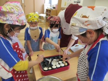 今日のおやつ”ホットケーキ”をたこ焼き器を使って4.5歳児の子どもたちが自分たちで焼きました。