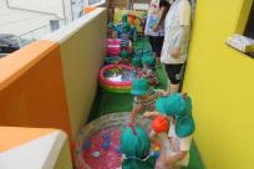 あひるぐみは屋上の少し大きめのビニールプールで・・・初めての経験でしたがみんな楽しそうに開放感を楽しんでいました。
