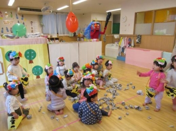 2月3日になれば立春! みんな一つ年齢が大きくなりみんなが健康で幸せになりますようにと願って各クラスが豆まきをしました。