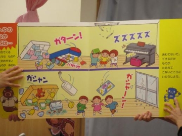 地震が起きたらみんなの部屋はどうなるのかを大型絵本を通して確認しました。
