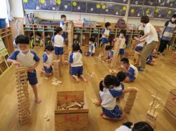 5歳児さんも新町保育園のパンダ組さんと一緒にカプラのワークショップに参加しました。