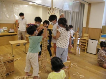はじめに、4歳児同士でカプラを自分の背丈くらいの高さまでつくったり・・・