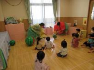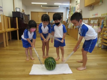 今日は、各クラスに分かれて大きな西瓜を割る真似っこ遊びをしてみました。