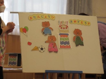 お誕生児のお友達をお祝いした後、先生がバルーンアートで剣や犬を作ってくれて、その後パネルシアター