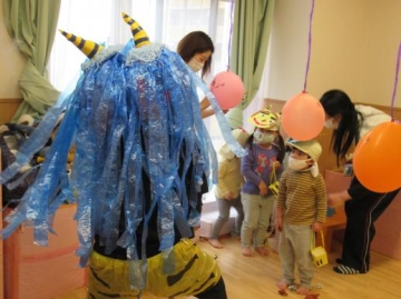 2歳児クラスは、鬼に連れていかれそうになり、戸惑っているみんな