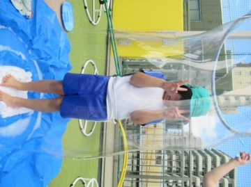 普通のシャボン玉遊びではなく、シャボン玉の中に子ども達が!!