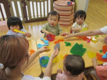 お椅子に上手に座り、あか・き・緑・オレンジのカラフルな寒天に触れ、冷たくてつるつるしている感触を