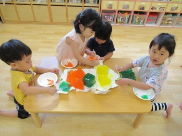 その後、1歳児2歳児は寒天遊び、0歳児は玄関ホールで好きな遊びを楽しみました(*^_^*)
