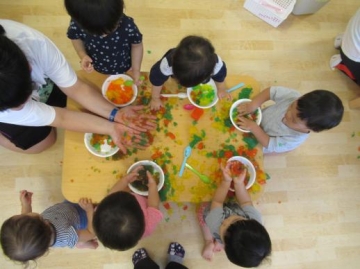寒天あそびは、最初は恐る恐る触っていた子ども達ですが、最後は粉々になるまで寒天の感触を楽しんでいました。