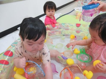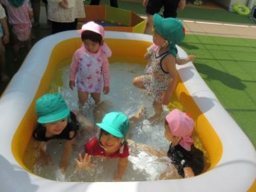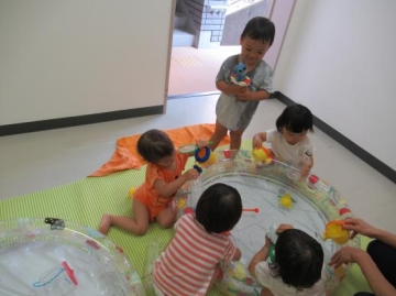 新町第3保育園の玄関ホールでは、小さなビニールプールでちゃぷちゃぷ💧
