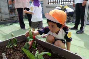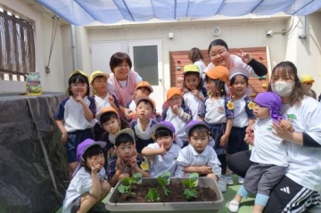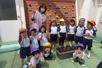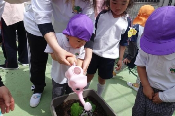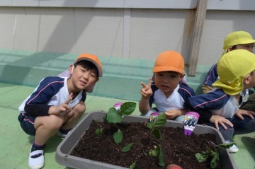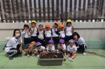 屋上で野菜の苗植えをしました。