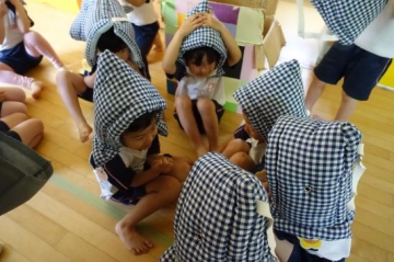 かぶり、頭を守る練習を